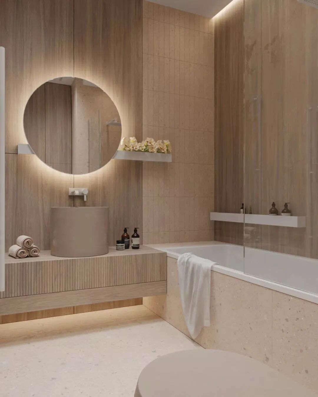 浴室的焦糖奶茶色空间是由浅原木+灯线+淡棕色复古小瓷砖+杏色浴缸外立面等不同材质组合而成,虽然色系单一,却依然层次感十足,于有厚实感的温暖中透出优雅柔和,让人放松。